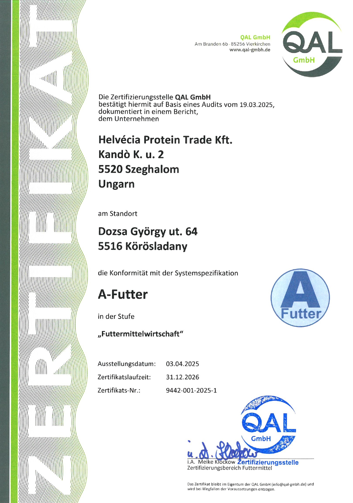 L’entreprise Helvécia Protein Trade a adopté le système de gestion de la qualité ISO 9001:20009 en 2003. Elle est munie de la certification QS et A-Futter depuis 2005. Ces deux systèmes de certification imposent des contrôles réguliers, si bien que les fourrages que notre entreprise produit sont en permanence examinés et évalués par les laboratoires autrichiens de l’agence Österreichische Agentur für Gesundheit und Ernährungssicherheit GmbH Institut für Futtermittel. Depuis 2012, deux nouveaux systèmes de certification ont été ajoutés aux précédents : ISO 22000:2005 HU-MSZT-ÉBIR/026-24, et ISO 14001:2004 HU-MSZT-KIR/186-163.
